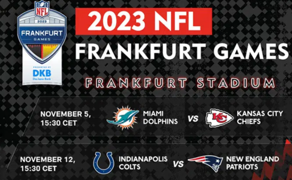 | Sunday, November 12, 2023 | Indianapolis Colts vs. New England Patriots | 3:30 p.m. / 2:30 p.m. / 9:30 a.m. | Frankfurt Stadium |