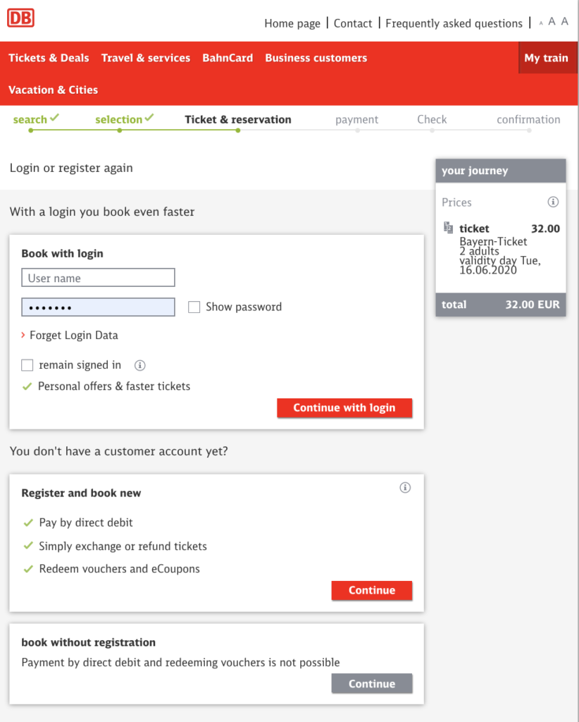 STEP FIVE: Okay – the last step before paying! Enter your details and make sure you properly enter in the names of each person using the Bayern Ticket. Remember that these tickets aren’t transferable, and only the travellers whose names are on the ticket may use it.