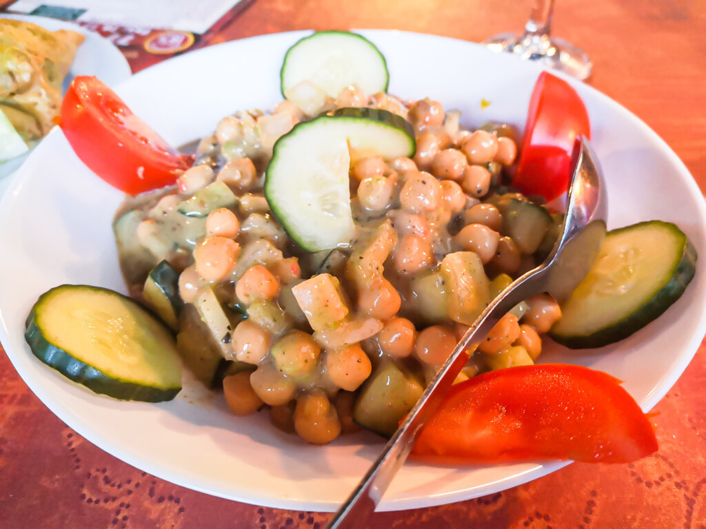 This dish has a very tangy and vinegary taste at first, but it’s balanced well by the creaminess of the chickpeas and the crispness of the cucumber.