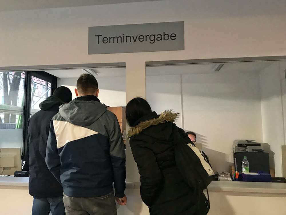 [Based on experience at the main KVR building] Whereas before, walk-ins would basically have to wait in line very early and then run to grab a number in the designated room for your surname, now there is a special part of the KVR, the “Terminvergabe” where you have to go and make an appointment first. It looks like this and you can find it on the ground floor if you just run straight in from the main entrance: