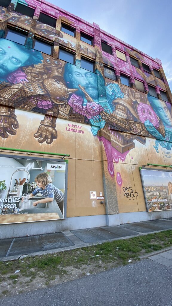 One of the most spectacular large murals in Munich can be found in Giesing on Zehentbauernstraße 8. The mural depicts famous fighters of resistance, including Kurt Eisner, Sarah Lerch-Rabinovitz, Erich Mühsam, Gustav Landauer and Ernst Toller.